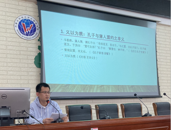 闫维康老师以英国汉学家理雅各眼中的孔子为题,分享了对中国文化对外传播中存在问题的思考。他指出,在中国文化“走出去”的时代背景下,中国文化典籍外译的一项重要任务就是客观公正地重新审视传教士译本,拨正西方世界对中国文化的认知与改写,在此基础上才能切入西方世界对中国文化的理解与接受,从而为中西方文明互鉴、思想对话提供宝贵的参考意义。在讲座中,闫维康老师讲到了个人读博前后的经历,认为攻读博士学位的过程使他开阔了眼界,在学术方面有更多积累,从而提升了自信心。同时,闫老师还分享了自己论文写作、投稿的经历,鼓励年轻老师们多做尝试并积极申博。