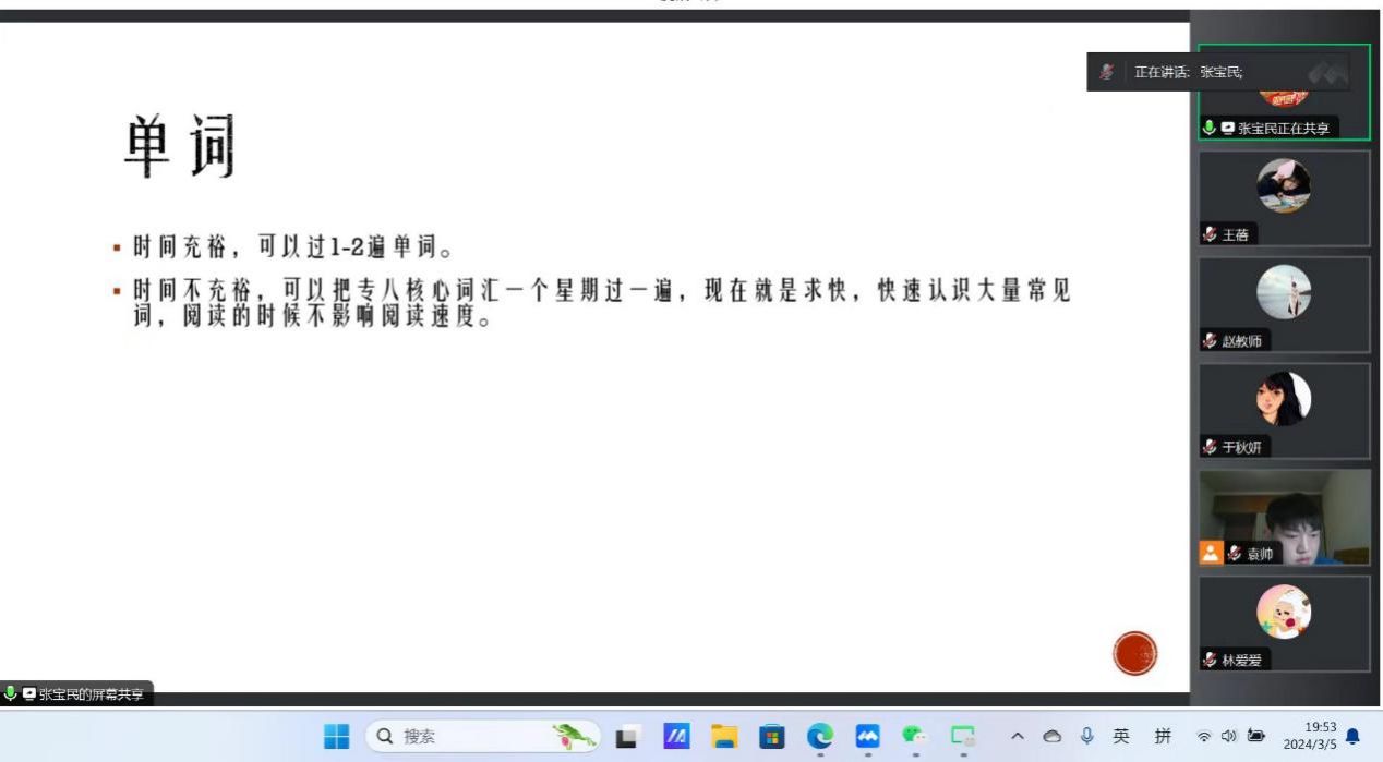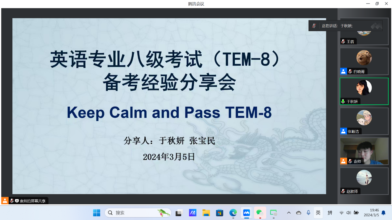 举办专八经验备考分享会时,我们请到了2022届商务英语专业毕业生于秋妍和2023届英语专业毕业生张宝明,两名同学都是当年的研究生保送员工。两名同学分别从专八考试的题型、专八单词准备及应对方法入手,详细梳理了每种题型的注意事项,强调练习的重要性,还为同学们解答了备考过程中出现的问题。